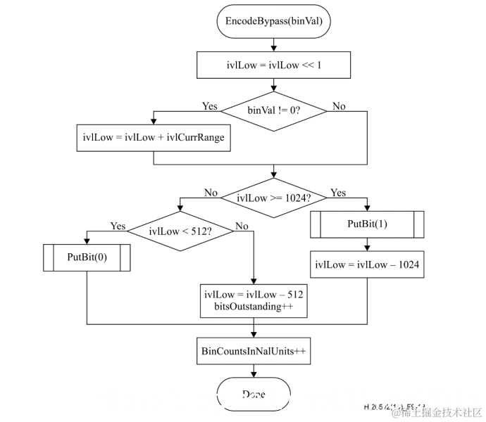 旁路编码不需要对概率模型进行更新,而是采用0和1概率各1/2的方式进行编码。当bypassFlag标志位为1时采用旁路编码。为了使区间划分更加简单,不采用直接对区间长度二等分的方法,而是采用保持编码区间长度不变使区间下限L加倍的方法实现区间划分。随后进行重归一化操作。旁路编码流程如下: