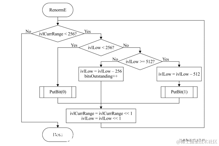 4、当R>=256时,无法判断编码区间,需要通过输入下一个符号对R和L进行更新后继续判断,因此当前符号编码流程结束。由于这个原因,因此在一个符号编码结束后,另一个符号编码开始前,总是256<=R<512。