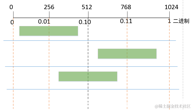 2、当R<256&L>=512时,区间落在[512,1024)间,即[0.5,1)间。此时输出1(PutBit(1)),因为此区间内的数都是0.1x(二进制)。