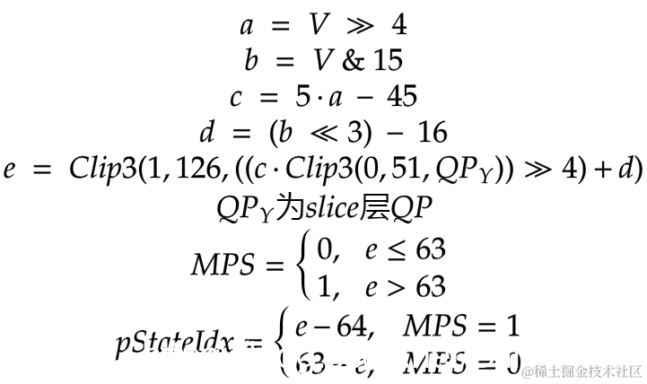 算术编码首先需要估计每个符号概率然后进行区间划分。在CABAC中总是估计LPS的概率(P_lps<0.5),且LPS的概率通过64个离散值表示可以通过查表得到概率索引pStateIdx(见上一节)。