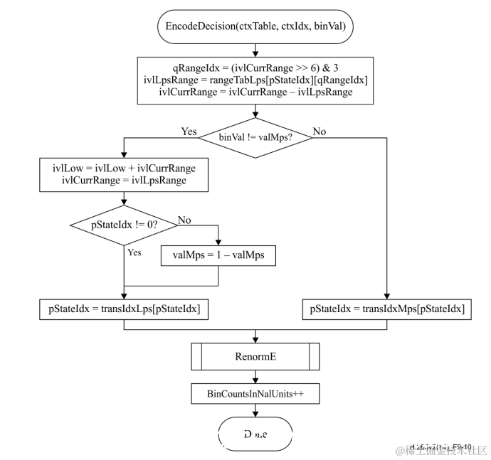 编码器输入是上下文模型变量和待编码Bin,编码器的状态是当前编码区间长度ivlCurrRange和区间下限ivlLow。