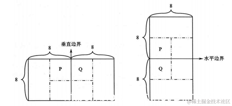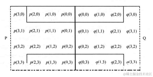 下图是一个垂直块边界区域示意图。p(x,y),q(x,y)分别是边界两侧的像素值。