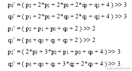 当上面滤波决策判定为需要滤波时,则需要进行滤波操作。包括3种情况:亮度边界的强滤波、亮度边界的弱滤波、色度边界的滤波。