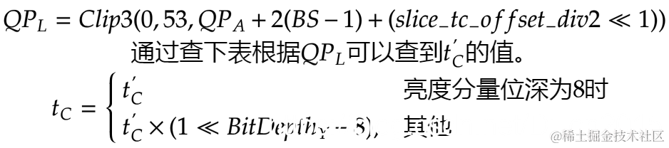 当上面6个式子都满足时采用强滤波,否则采用弱滤波。第1、2式用于判断边界两侧像素值变化率,第3、4式用于判断边界两侧像素是否平坦,第5,6式用于判断边界处像素的跨度是否控制在一定范围。tc是判决门限,其与边界两侧块的量化参数QP有关,由下面方法得出。