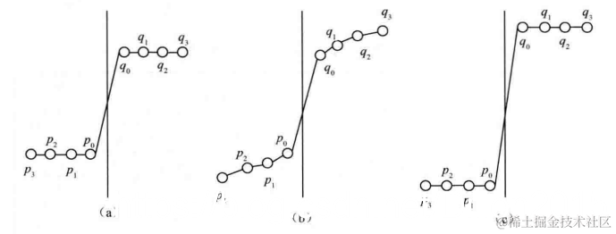 上面3种边界情况,(a)与(b)相比,边界两侧像素平坦而边界处变化剧烈,在视觉上会形成更强的块效应,需要对边界周围像素进行大范围、大幅度修正。(c)边界处像素变化特别大,由于失真总会处于一定范围,当差值超出一定范围后,这种块边界则是由视频内容本身所致。
