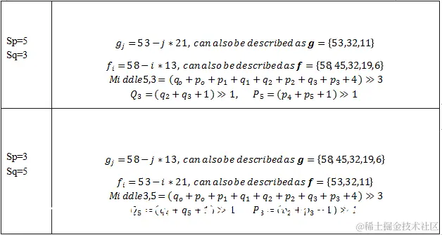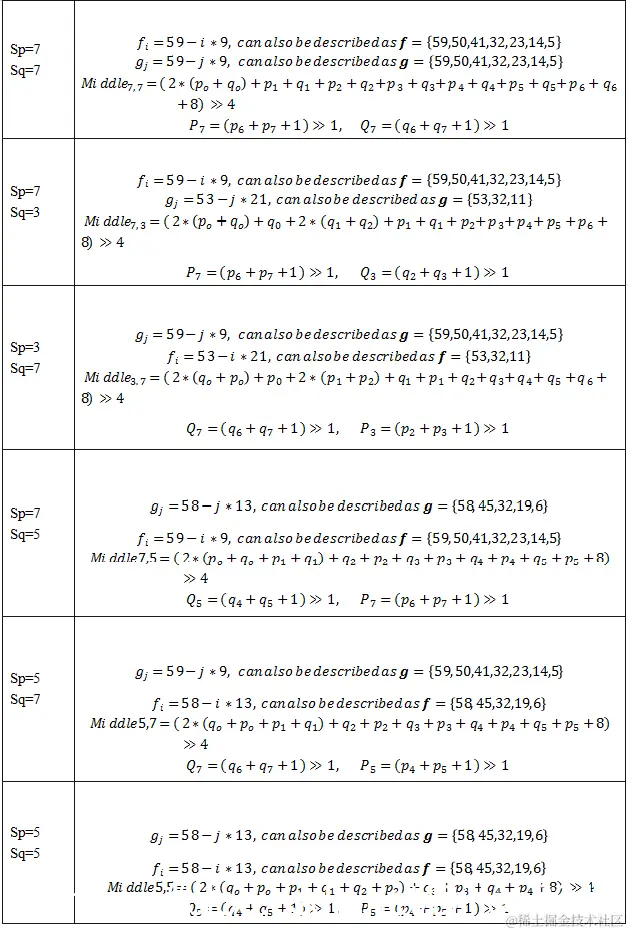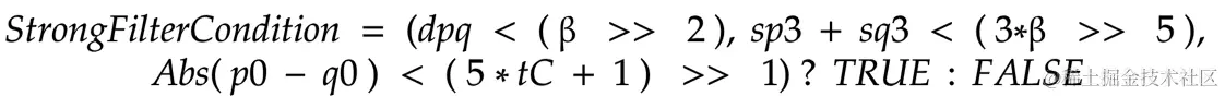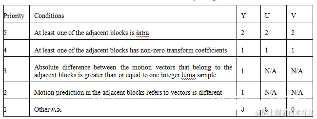 当色度边界长度大于等于8,且满足下面3个条件时,色度边界使用强滤波。(1)边界强度和大块条件。VVC中色度边界强度计算如下表,当高优先级条件满足时不再检查低优先级条件。当BS=2或BS=1且边界属于一个大块时才进行滤波。条件(2)(3)分别和HEVC中滤波开关决策和强滤波决策一样。