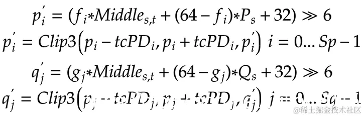 srcQ[offset*pos] = Clip3(src - cvalue, src + cvalue, ((refMiddle*dbCoeffsQ[pos] + refQ * (64 - dbCoeffsQ[pos]) + 32) >> 6));