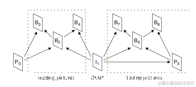 前面提到视频序列里包含不同类型的图像,I帧(只使用帧内预测)、P帧(单向帧间预测)、B帧(双向帧间预测)。由于P帧和B帧在帧间预测时要参考其他帧,所以形成了不同帧间的时域依赖关系(时域预测帧必须在其参考帧解码后才能解码)。