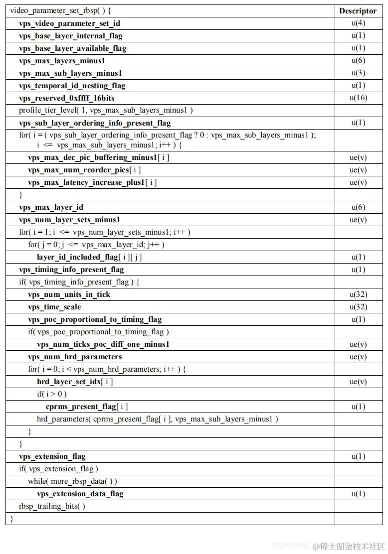 HEVC中定义了VPS的各个语法元素及描述子,如下表所示。描述子即语法元素的熵解码算法,描述子定义如下: