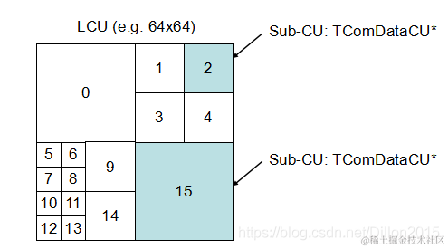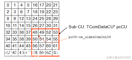 实际上整个CTU的信息都在TComDataCU类中,且数据仅在CTU中存储一份,子CU只需指定其在CTU中的位置即可。类中成员变量m_absZIdxInCtu表示子CU在CTU中的位置(zig-zag顺序)。