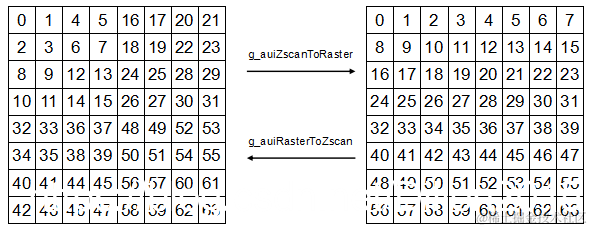 HM中提供了两个数组g_auiZscanToRaster和g_auiRasterToZscan可以进行zig-zag顺序和光栅扫描顺序间的转换。