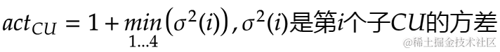 CU的活动性由其亮度分量的方差计算得到。例如,对于一个2Nx2N的CU,首先计算其4个NxN的亮度子块的方差,然后由方差计算该CU的活动性actcu: