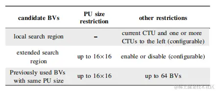为了决定是否对当前CU使用IBC模式,需要对CU计算其率失真代价。在编码端使用块匹配(Block Matchong,BM)为每个PU寻找最优BV。根据PU尺寸,有以下三类BV候选项。
