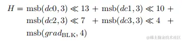 msb(X,n)表示X的最高n个有效位。dc0,dc1,dc2,dc3分别表示8x8块的4个4x4子块的DC值。grad_BLK表示8x8块的梯度。