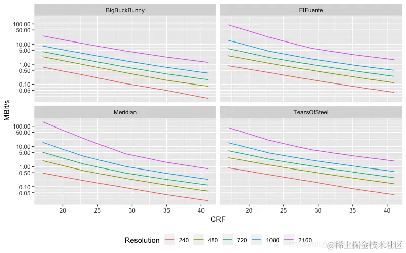 为了让你直观了解不同分辨率视频的码率与CRF的关系,下面给出了复杂度不同的4段1分钟视频的平均码率(MBit/s)与CRF的关系。编码器为x264。