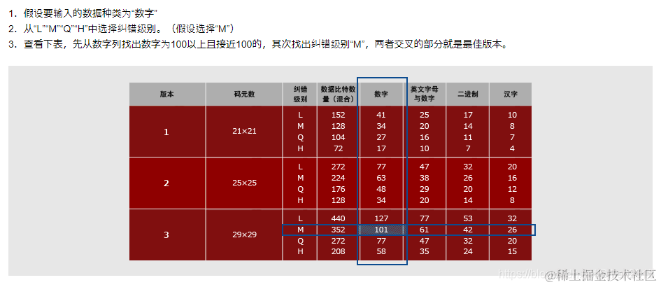 二维码一共有40个Version,Version 规定了二维码的尺寸,Version 1是21 x 21的矩阵,Version 2是 25 x 25的矩阵,Version 3是29x29的尺寸,每增加一个version,就会增加4的尺寸,公式是:(V-1)x4 + 21(V是版本号) 最高Version 40,(40-1)*4+21 = 177,所以最高是177 x 177 的正方形。
