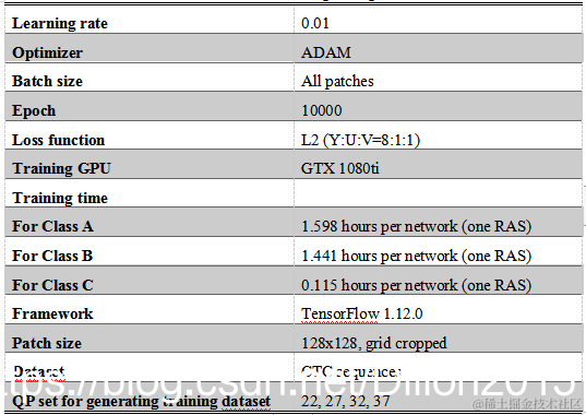 为了减少复杂度,仅使用时域第0层和第1层的图像训练CNN参数。也就意味着,只有这些图像需要编码两次。第一次编码用于生产CNN的训练数据,第二次编码生成最终码流。训练信息如下表: