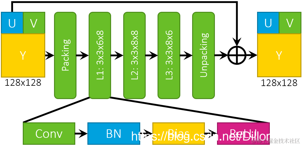 经过三层CNN之后,数据尺寸仍为64x64x6。在Unpacking阶段,前4个通道组成亮度CTB,后两个通道分别形成两个色度CTB。最终CNNLF的输出为Unpacking的输出加上ALF的输出得到。
