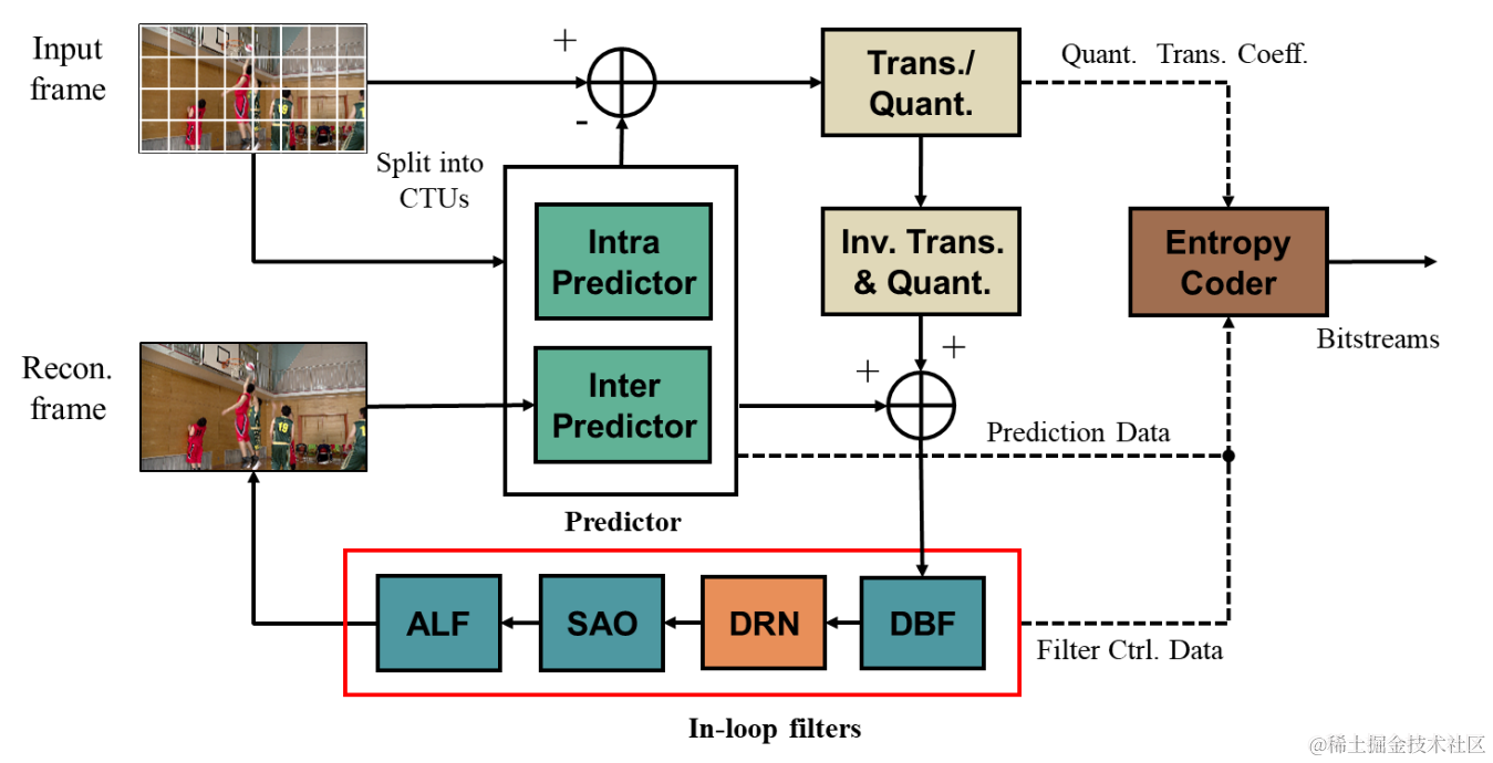 本文算法来自JVET-L0242,dense residual convolutional network based in-loop filter (DRNLF)用于VTM的环路滤波中,用在DBF之后,SAO和ALF之前,如下图所示。