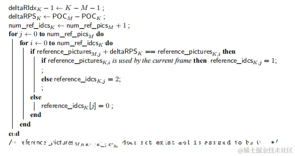 FrameK的deltaRIdx-1, deltaRPS, num_ref_idcs和Reference_idcs参数可以通过其POC和FrameM的POC,num_ref_idcs,reference_pictures值生成。K表示待编码RPS的索引,M是参考RPS的索引。生成过程如下: