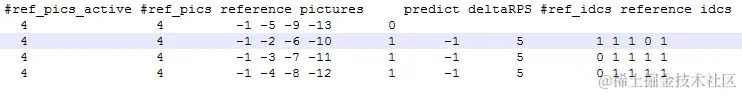 Frame2的参考图像POC为0和4,所以对应的reference_idcs为1,1,第1个1表示参考RPS(Frame1的RPS)中的-4仍作为参考,第2个1表示Frame1本身也用作参考。