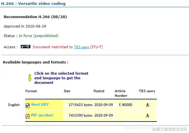H.266/VVC标准的文本也于2020-09-09在ITU官网发布,可以到www.itu.int/rec/T-REC-H…上下载。不过目前仅支持TIES会员下载,估计过段时间会开放普通下载。