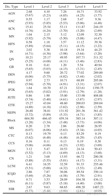 研究发现质量失真会引起视觉显著性(Visual Saliency,VS)的改变,并且这种改变与失真有很强的相关性。为了验证这个猜想可以进行实验,可以对TID2013数据集的VS maps进行分析。TID2013有25个参考图像,24种失真类型,5个失真水平。每种类型的每个水平的失真对应25个失真图像。首先使用GBVS模型对数据集中所有图像计算VS map。然后对每个失真图像计算其与对应参考图像的VS map的MSE(均方误差)。对同一类型同一水平失真的MSE求均值。结果如下图所示(括号内是对应主观评分):