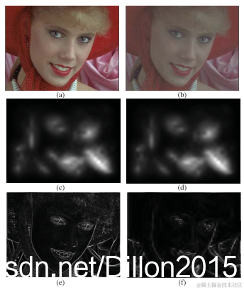 上图中a是参考图像,c和e是不同类型失真。bdf分别是ace对应的VS map。c和e的主观评分分别是5.05,2.40。d和b的VS map的MSE为4.49,f和b的VS map的MSE为198.36。可以看到e的主观质量比c更差,其VS map的失真(MSE)也越大。