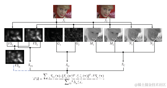 使用上面的VS,GM和色度特征可以定义VS-based index (VSI)。例如,对于给定的图像f1和f2,其VSI计算方式为,首先提取f1和f2的VS map分别为VS1和VS2,然后是f1和f2的GM map分别为G1和G2,M1和M2分别代表f1和f2的M通道,N1和N2分别代表f1和f2的N通道。
