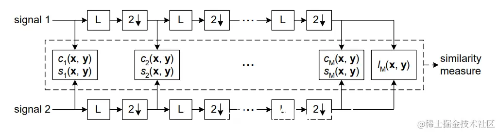 MSSIM的流程如上图所示。将参考图像和失真图像作为输入,然后分别依次迭代的使用低通滤波器和1/2降采样。假设原始图像为Scale 1,最高尺度为Scale M经过M-1次迭代得到。对于第j个尺度,只计算对比度c(x,y)和结构相似度s(x,y)。仅在Scale M计算亮度相似度l(x,y)。如上图所示。