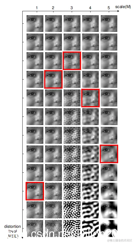 上图中,每一行的MSE都相同,每一列的scale都相同。对于给定的8bit灰度图像,我们可以合成上面的失真图像表。这里有5个scale,12个失真水平,共60幅图像。可以看到每行的MSE都相同,但是它们的感知质量却差别很大,这说明不同尺度的失真对感知质量的影响不同。