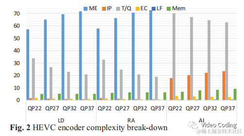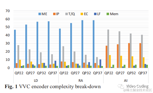 上图Fig.2是HEVC编码器各模块复杂度分布情况。和VVC相比可以明显看出LF占比较小,在LD配置下HEVC占比0.1%而VVC占比5.5%。同样在LD配置下IP在HEVC占比1%,在VVC占比5%。EC、ME、T/Q在VVC中的占比近似为HEVC中的0.8倍。实际上VVC中的ME复杂度比HEVC要高,这说明其他工具复杂度升高的比重更大。
