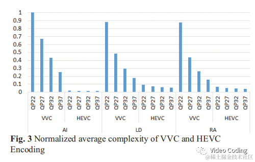 上图Fig.3展示了VVC和HEVC的720p和1080p视频编码器平均复杂度比较情况。平均来说在LD,RA,AI配置下,VVC的平均复杂度分别是HEVC的5倍,7倍,31倍。一个有趣的发现是,不像其他标准帧内编码比帧间编码简单很多,在VVC在LD和RA配置下帧内编码分别是1.3倍和1.4倍。而且VVC的复杂度和QP很相关,在LD配置下QP=22的复杂度是QP=37的4.8倍,而在HEVC中是1.6倍,这意味着要达到更好的质量需要更多的处理。