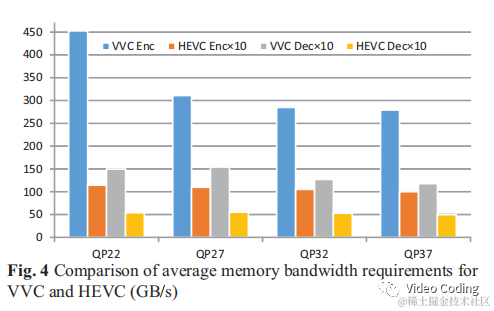上图Fig.4是内存占用情况,是在LD配置下1080p视频中的测试结果。由于VTM和HM都达不到实时编码,上面的结果都缩放到实时情况,且为了更好的展示图中结果都乘以10了。可以看到QP越小内存消耗越大。VVC的平均编码和解码内存带宽分别是332GB/s和14GB/s,而HEVC分别是11GB/s和5GB/s。这是因为VVC的CU尺寸更大,预测候选项更大需要更大存储空间,而且不同的CU组合和各种编码模式导致对相同数据的多次和不规则访问。