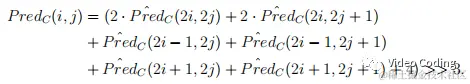 对于2Nx2N的亮度CB,其对应色度CB为NxN(4:2:0格式),若对色度CB使用CCLM则对应预测值通过下式获得,
