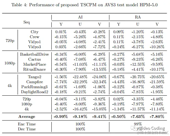 可以看见对于所有序列尤其是4k序列,TSCPM表现良好。在AI配置下YUV分量BD-Rate增益分别为0.99%,9.18%,9。41%。在RA配置下YUV分量BD-Rate增益分别为0.50%,7.63%,7.80%。