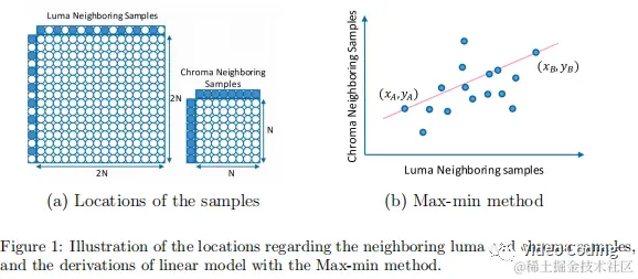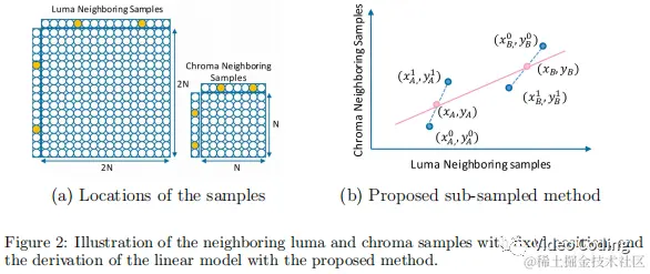 CCLM(Cross-component linear prediction mode)使用一个线性模型来通过亮度来预测色度。该线性模型使用最小二乘法( least square regression,LSR)利用邻域参考像素生成。