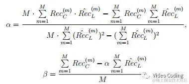 Predc是色度预测值,RecL是对应亮度块重建值的降采样结果。alpha和beta是模型参数,利用邻域亮度和色度重建值通过LSR方法计算得到,