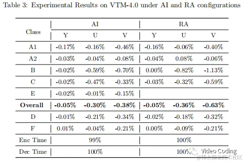 在AI配置下YUV分量BD-Rate增益分别为0.05%,0.30%,0.38%。在RA配置下YUV分量BD-Rate增益分别为0.05%,0.36%,0.63%。增益最大的是A1序列(4k序列)。