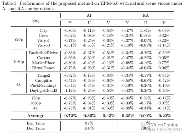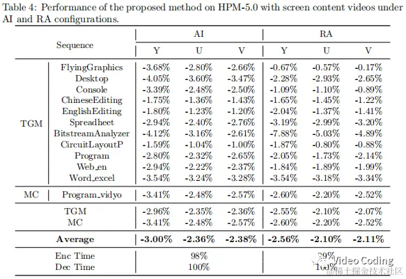 实验平台是AVS3的HPM5.0,配置为AI和RA,QP为27,32,37,45。序列包括自然场景和SCC场景。结果如表3和表4所示。该最优帧内 full-RD list构建方法已经集成到AVS3参考软件中。
