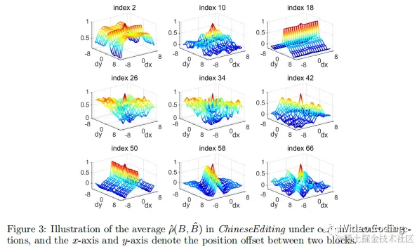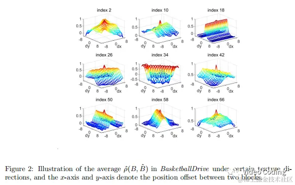 接下来,本文研究了在特定纹理方向Mopt下的当前块与相邻块间的相关性。Fig.2和Fig.3分别展示了自然场景和屏幕内容场景(SCC)的不同方向模式的平均块相关性,为了方便可视化只展示了9个方向。