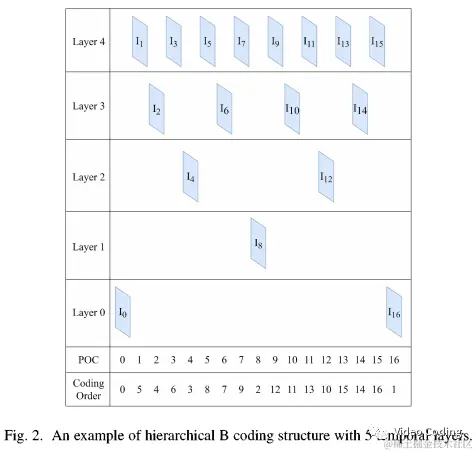 本算法利用HEVC在RA配置下的分层B帧结构,分层B帧结构有5个时域层,如下图所示。