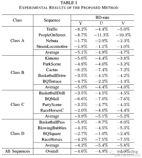 使用class A到class D的序列进行测试,结果如上表所示。亮度分量可以达到4.6%的BD-rate增益。尤其是在高分辨率的视频上算法表现更好,在PeopleOnStreet序列上可以达到8.7%的BD-rate增益。此外,为了测试微调策略的有效性,和class B序列上和不使用微调的模型相比使用微调可以达到0.5%的BD-rate增益。