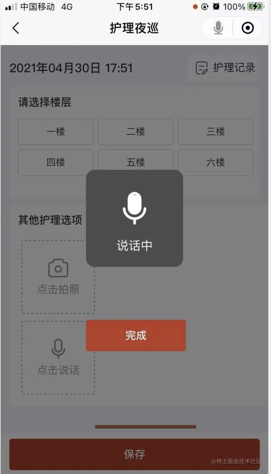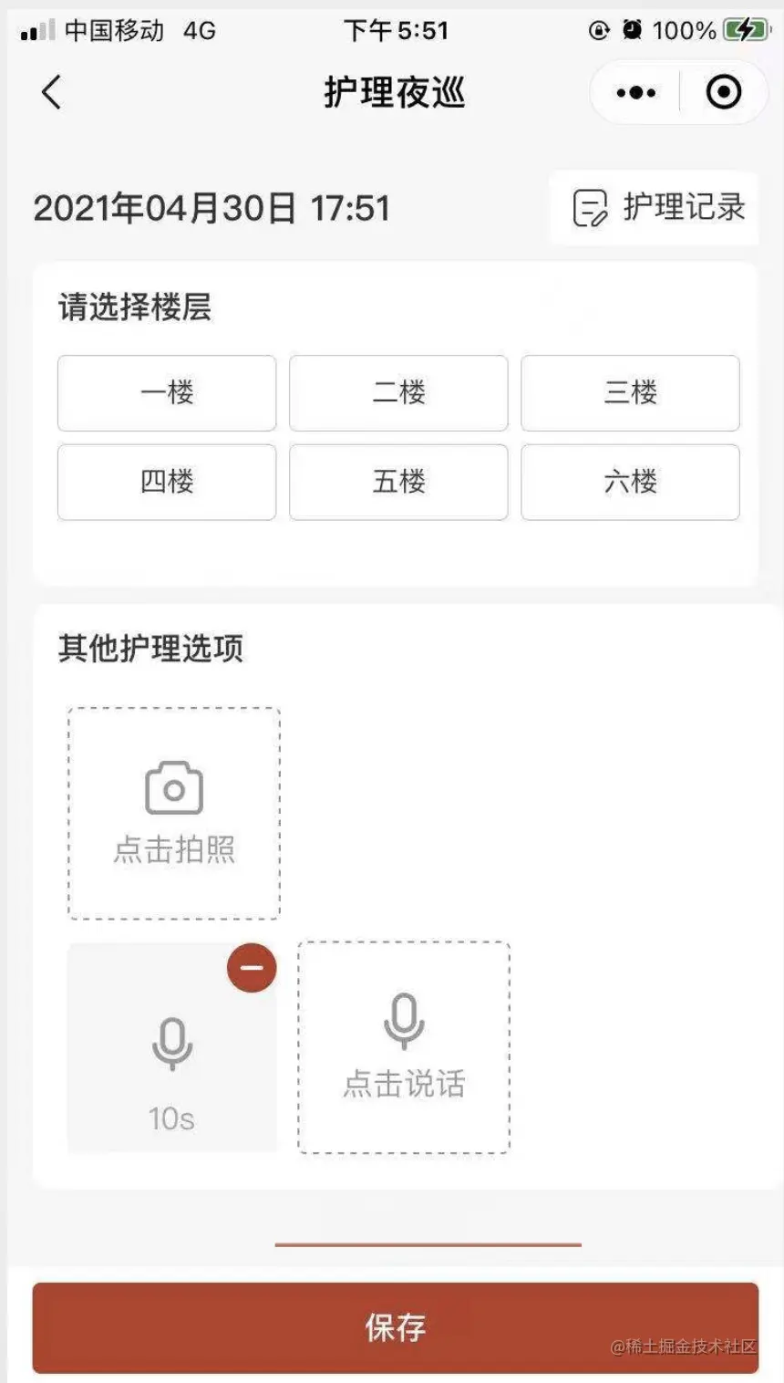 社区养老中心有一组常住的老人,晚上需要护理人员定期进行护理夜巡,防止晚上老人有突发状况没有及时得到救助 这里护理人员夜巡之后有个记录语音的需求场景,下面记录分享下录音主要功能实现