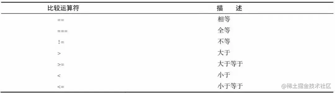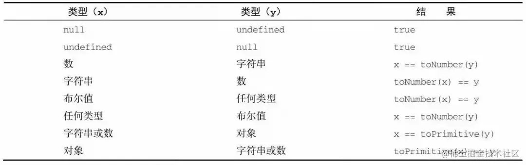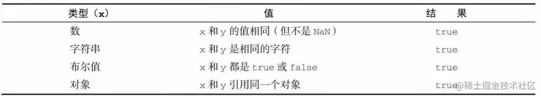 ===运算符呢?简单多了。如果比较的两个值类型不同,比较的结果就是false。如果比较的两个值类型相同,结果会根据下表判断。