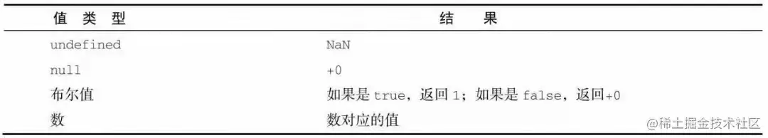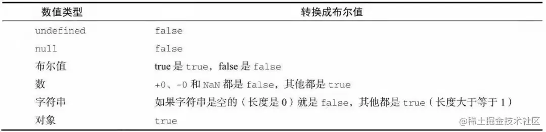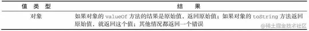 用例子来验证一下表格中的结果。首先,我们知道下面的代码输出true(字符串长度大于1)。 console.log('packt' ? true : false); 那么下面这行代码的结果呢? console.log('packt' == true); 输出是false,为什么会这样呢? ❑ 首先,布尔值会被toNumber方法转成数,因此得到packt == 1。 ❑ 其次,用toNumber转换字符串值。因为字符串包含字母,所以会被转成NaN,表达式就变成了NaN == 1,结果就是false。 那么下面这行代码的结果呢? console.log('packt' == false); 输出也是false,为什么呢? ❑ 首先,布尔值会被toNumber方法转成数,因此得到packt == 0。 ❑ 其次,用toNumber转换字符串值。因为字符串包含字母,所以会被转成NaN,表达式就变成了NaN == 0,结果就是false。