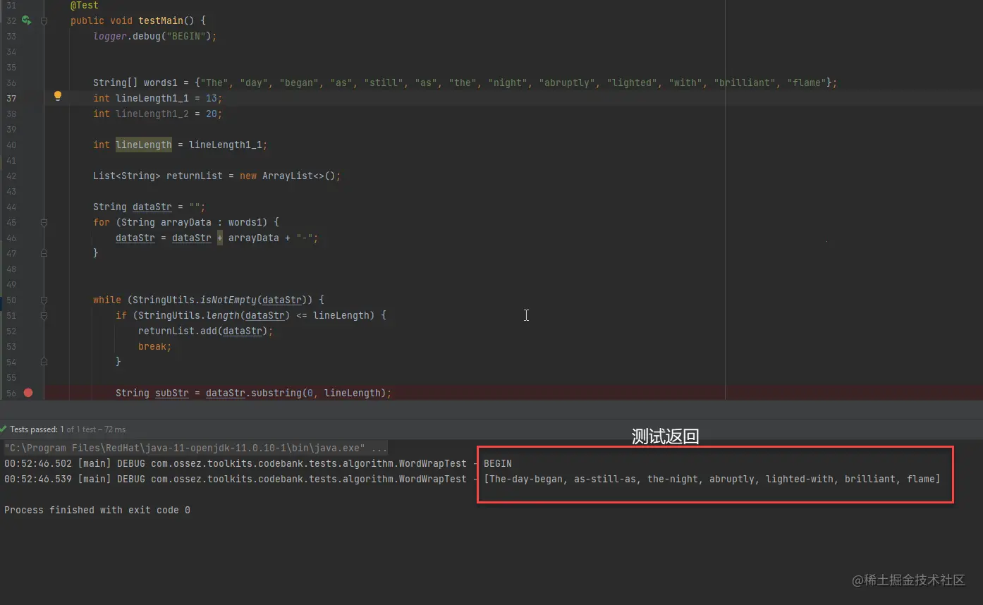 下一步,对字符串,从头到给定的长度进行截断后获得子字符串,随后对子字符串进行判断,如果这个子字符串是以横杠结尾的话,删除横杠然后压入需要返回的数组,然后更新需要处理的字符串为截断后余下的字符串。