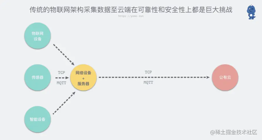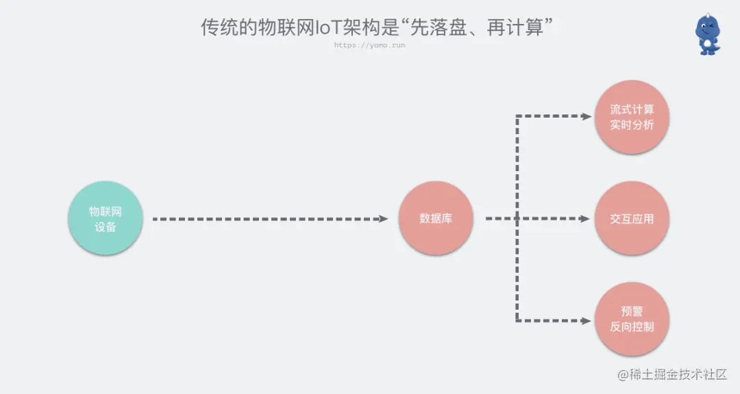 传统的大型物联网IoT架构经过十几年的发展,形成了“先落盘、再计算”的定式: