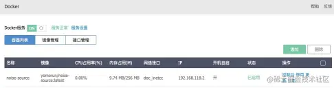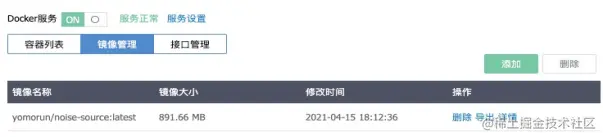 「插件管理」--> 「docker」--> 「镜像管理」--> 「添加」--> 「选择引用路径」--> 「填写文件路径: /cc/images/noise-source.tar」--> 「确认」