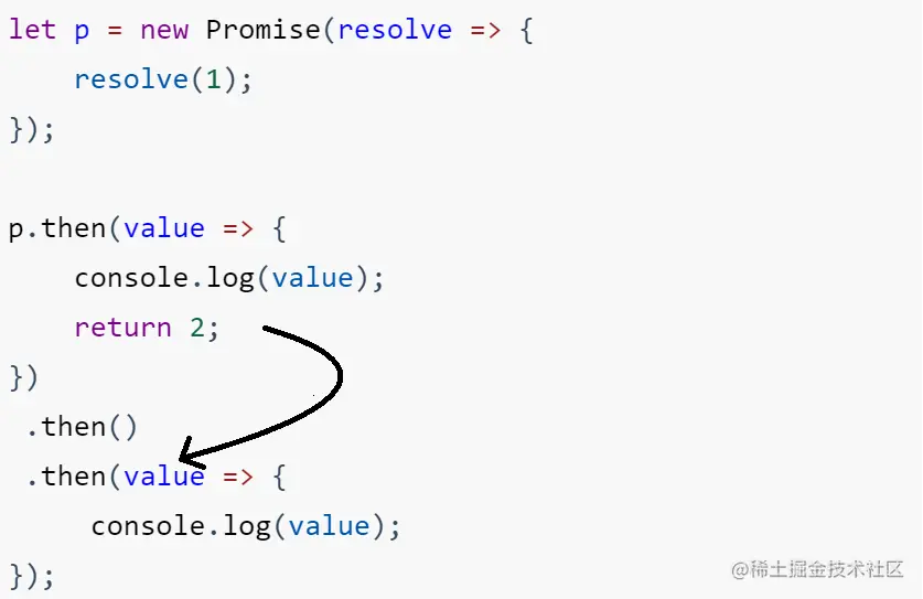 fn2 接收的参数 value 是通过 resolve 传入的,在上面我们通过 resolve(1) 传入了参数 1,所以 fn2 接受到的参数为 1。上面执行的结果为